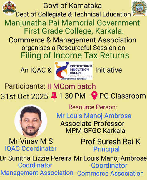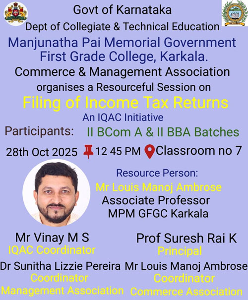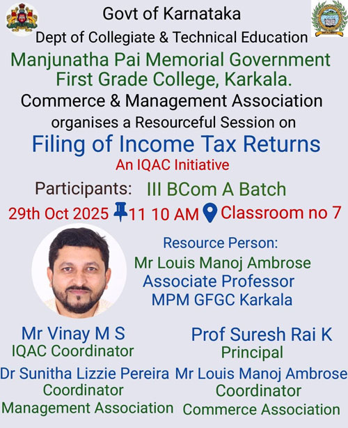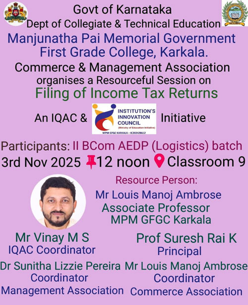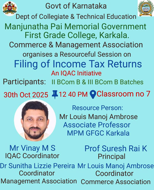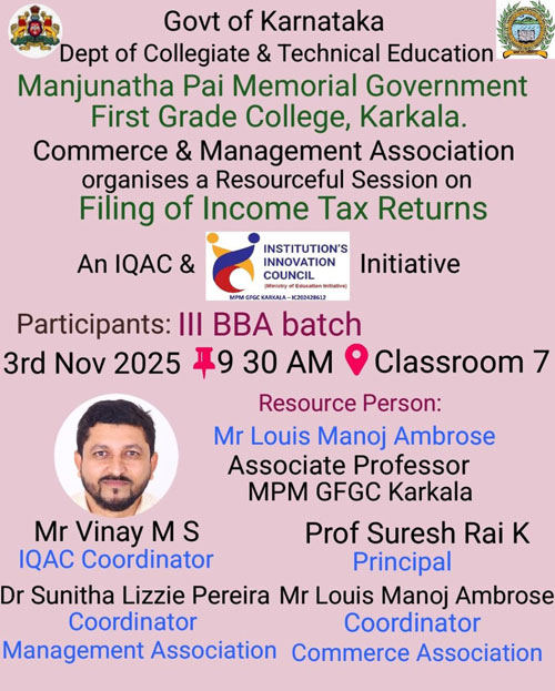 Karkala, Nov 3: Commerce and Management Association in collaboration with IQAC and Institution Innovation Council (IIC) of MPM GFGC Karkala organised six (6) sessions on 'Filing of ITR Form’ for II MCom, III-year and II-year BCom and BBA Students of our college (8 batches), covering around 750 students over a period of 6 days. The resource person was Louis Manoj Ambrose, associate professor of commerce, MPM GFGC Karkala.