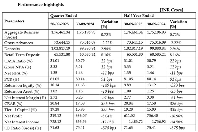 The aggregate business of the Bank stood at Rs 1,76,461.34 crore (on a gross basis) for Q2FY26 compared to Rs 1,77,509.19 crore in Q1FY26. The aggregate deposits of the bank stood at Rs 1,02,817.19 crore in Q2FY26 as against Rs 1,03,242.17 crore as of Q1FY26. Bank’s gross advances stood at Rs 73,644.15 crore in Q2FY26 when compared to Rs 74,267.02 crore as of Q1FY26, however there was a growth in the RAM (Retail, Agri & MSME) segment of the Bank. The CD ratio (gross) of the Bank stood at 71.63%.