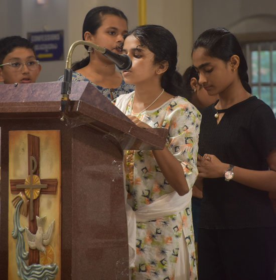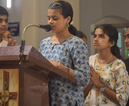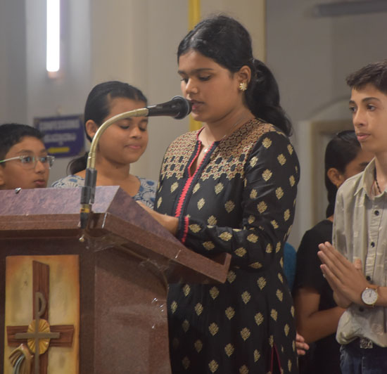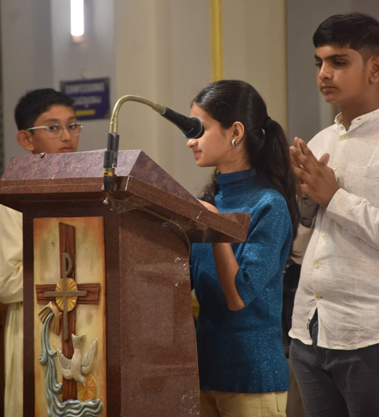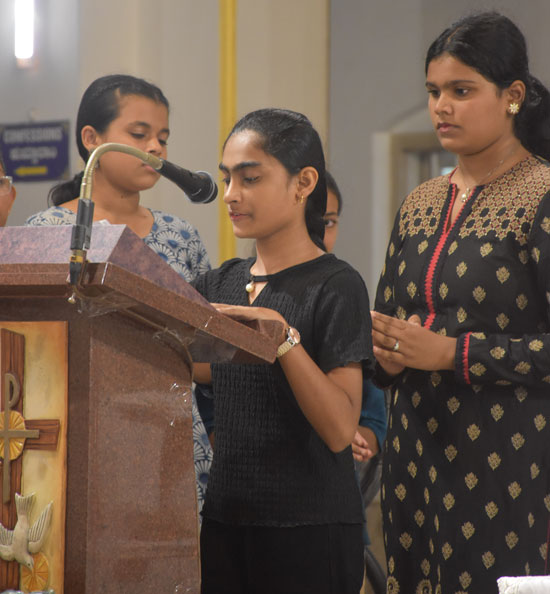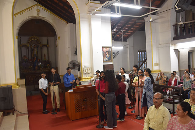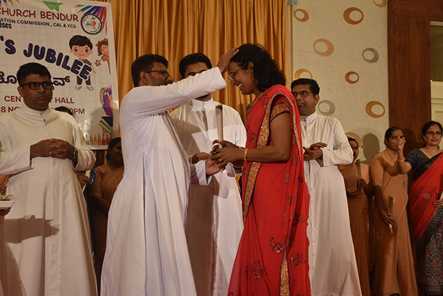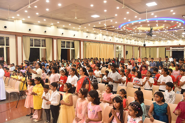 The ceremonial lighting of the lamp was done by the dignitaries: Fr Walter D’Souza vicar, Fr Vivek Pinto and Fr Ozmond D’Souza assistant priests, Fr Arun Lobo principal, Padua College, Vinod D’Souza vice president, Patsy Britto secretary, Deepak D’Souza all commission convener, Mercine Pereira catechism coordinator, Sr Shubha BS Bethany Convent superior, along with selected children.