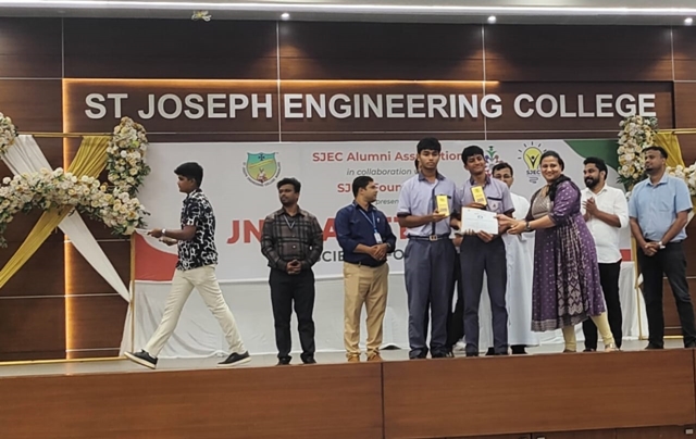 In addition, Kevin Kushalappa, Elric D’Silva, Mahendra Vasanth, and Arush Suraj Ullal impressed the audience by enthusiastically answering questions during the quiz, earning spot rewards for their responses. Kevin’s spontaneous on-stage feedback as a student participant was especially appreciated by Rev. Fr Wilfred Prakash D’Souza, director of SJEC.
