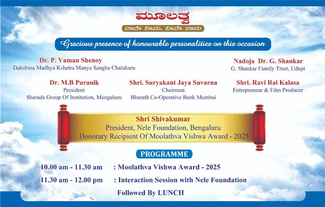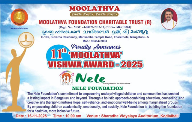 The Moolathva Vishwa Award function will be held on November 16 at 10 am at Sharada Vidyalaya Auditorium, Kodialbail, Mangaluru.