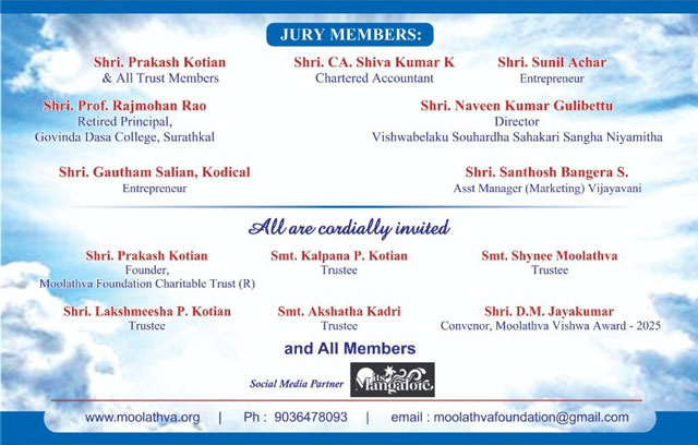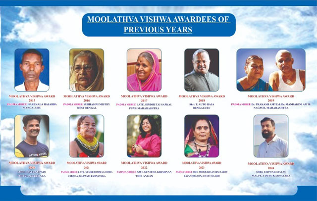 Ever since its inception it has been recognising eminent personalities who are rendering selfless service to the society, by honouring them with Moolathva Vishwa Award. Mangalurean Aksharasantha Harekala Hajabba (2015), West Bengal's Padmashree Subhashini Mistry (2016), Pune's Padmashree Sindhutai Sapkal (2017), Bengaluru's Auto Raja (2018), Nagpur's Prakash and Mandakini Amte Couple (2019), Udupi's Ravi Katpadi (2020), Ankola's Padmashree Sukri Bomma Gowda (2021), Telangana's Padmashri Sunitha Krishnan (2022), Chhattisgarh’s Padmashri Phool Basan Bai Yadav (2023) Malpe's (Udupi) Eshwar Malpe (2024) are the recipients of this award during the last 10 years.