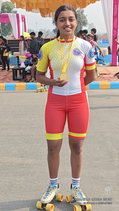 Jesnia delivered a commanding performance in the 500m rink race (Under-17 category) at HSV Global School, Gurgaon, Haryana, held from November 10 to 15. Her speed, precision, and focus placed her far ahead of her competitors, earning her the top honour and bringing pride to her school, parents, and coaches.