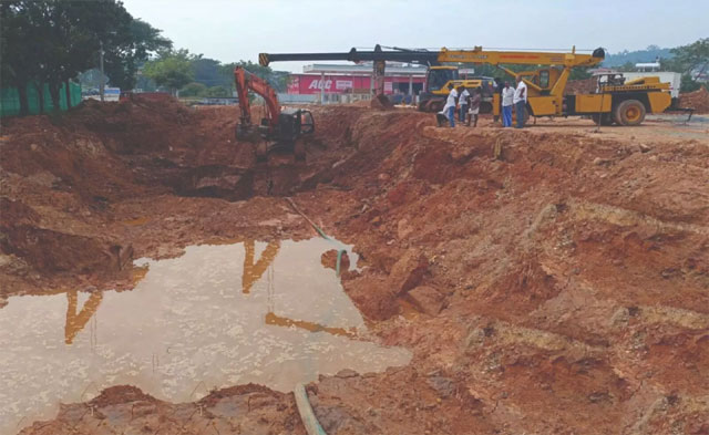 Soil covering the pipeline was removed through the day on Tuesday using excavators and tippers. The damaged section under the soil has now been identified. Water accumulated in the pit is currently being cleared. The pipe must be cut and welded, a process that will take more time, according to officials from the Mangaluru City Corporation water supply division.