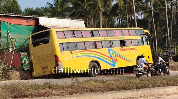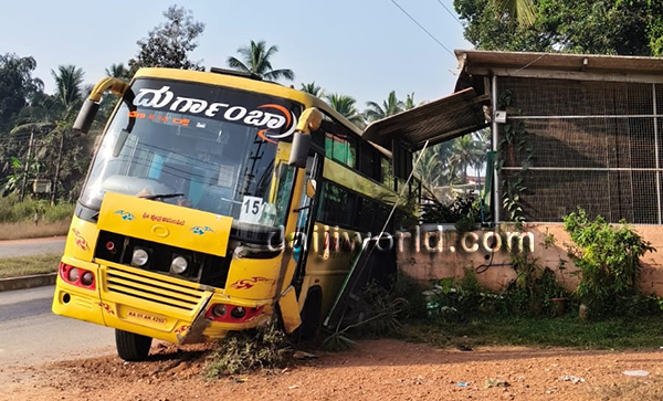 The bus was travelling from Udupi towards Hiriyadka when the driver reportedly lost control, causing the vehicle to veer off the road and ram into the hotel compound.