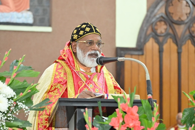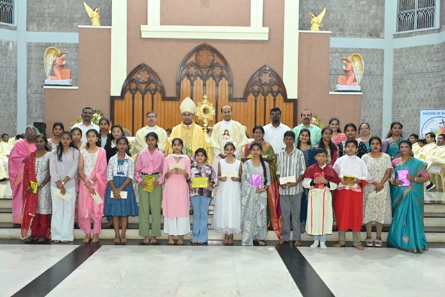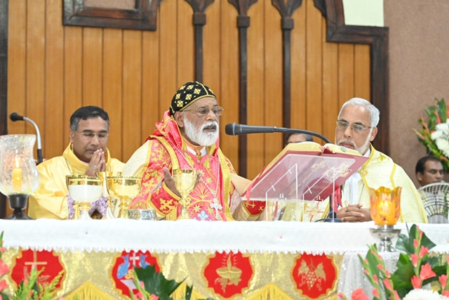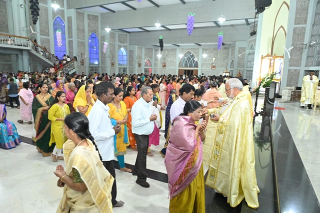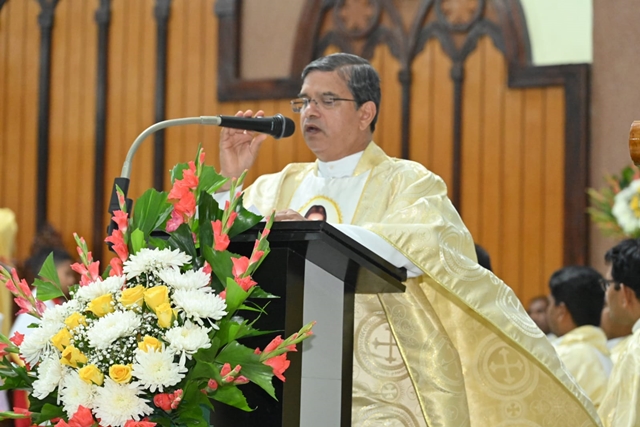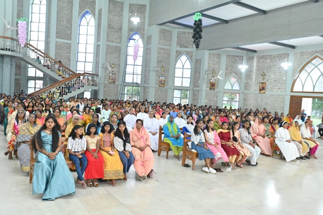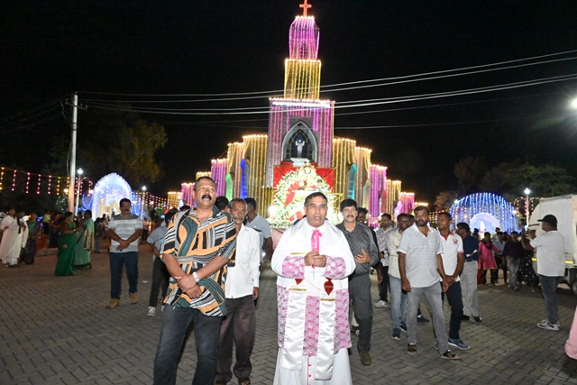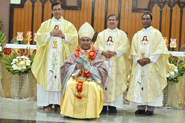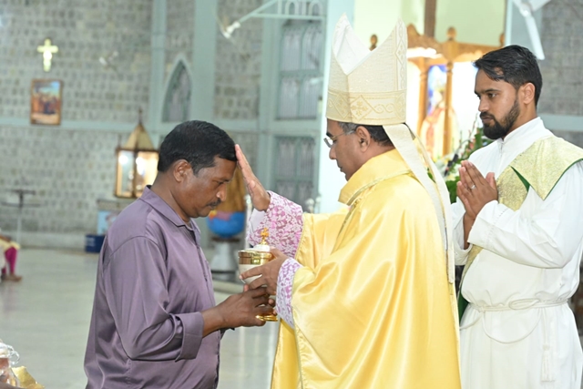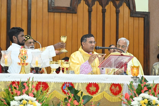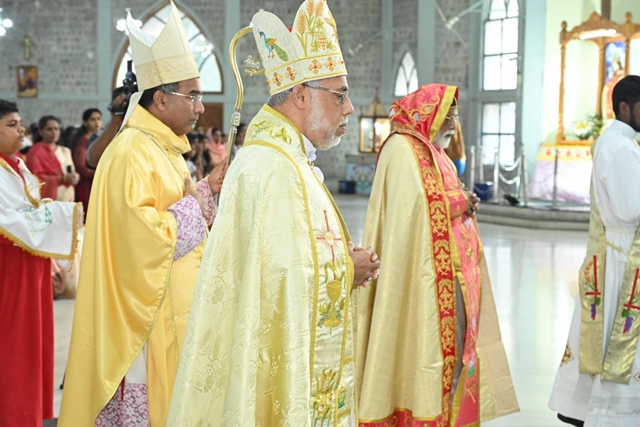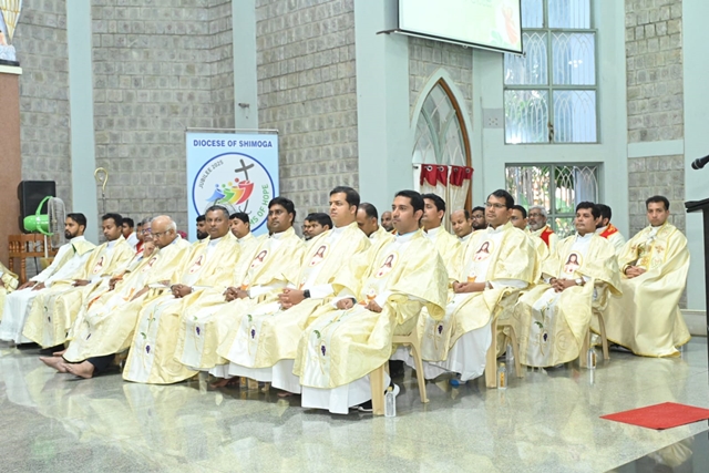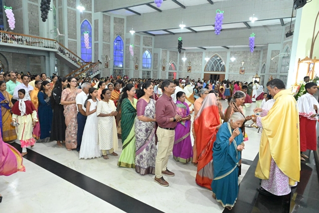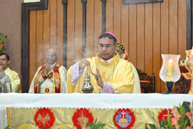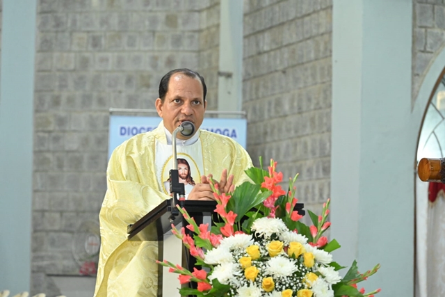At 5:15 pm, his excellency Dr Duming Dias, apostolic administrator of the Diocese of Shimoga, concelebrated the holy eucharist with his excellency Dr Joseph Arumachadath, bishop of the Diocese of Bhadravati, and his excellency Dr Geevarghese Makarios, bishop of the Diocese of Puttur. A substantial number of priests, religious, and faithful participated in the festal mass and offered prayers for peace.