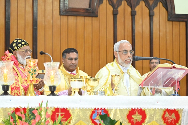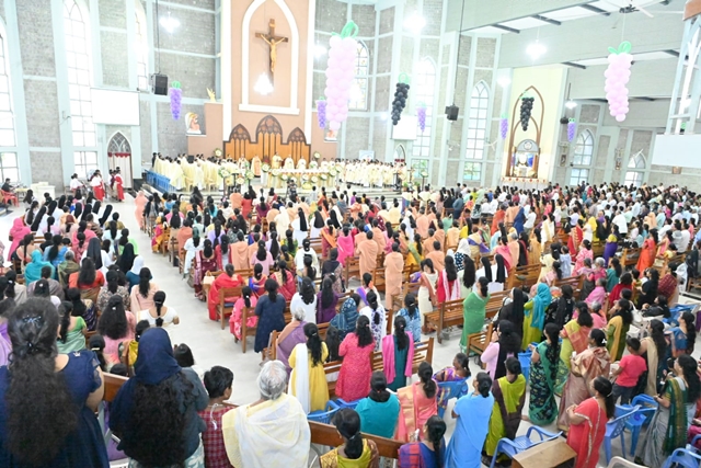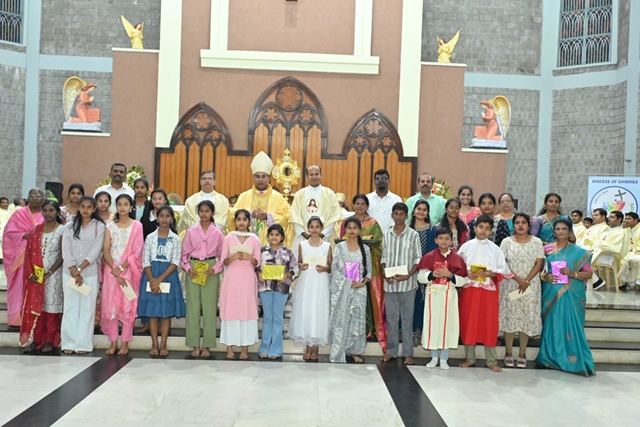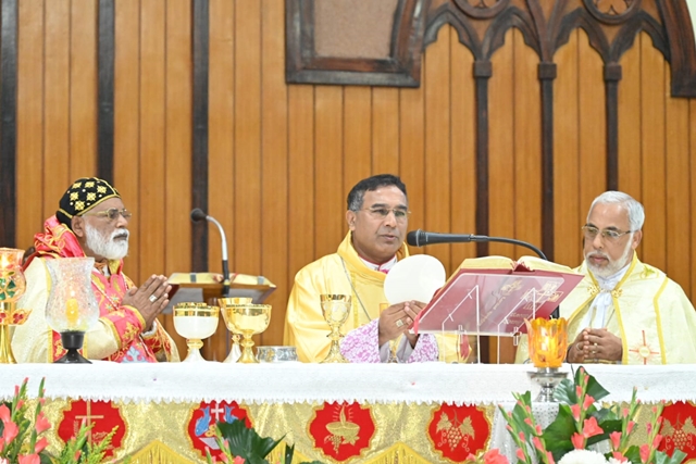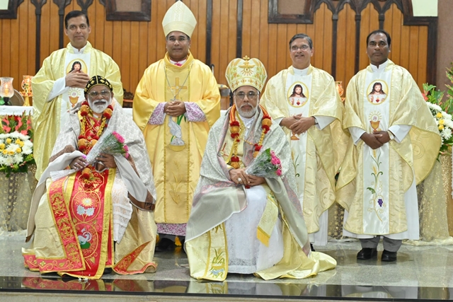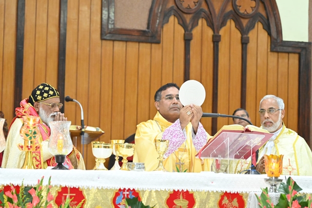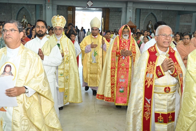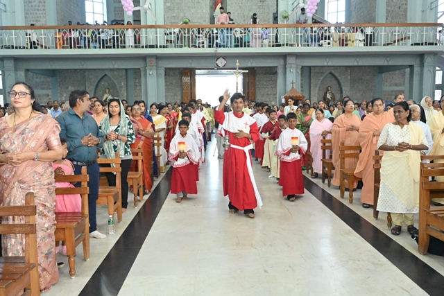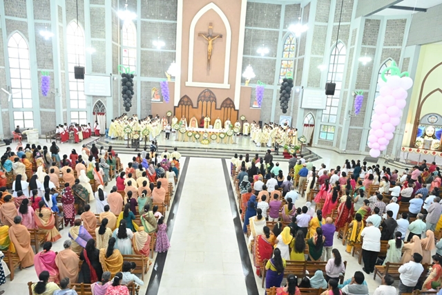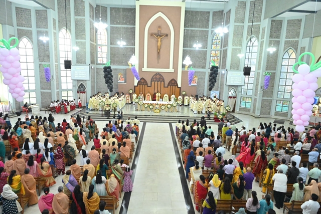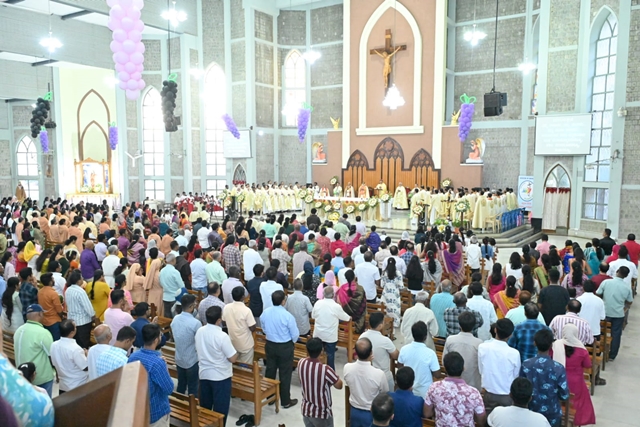 Shivamogga, Nov 24: The inter-diocesan Christ The King celebration took place at Sacred Heart Cathedral, Shivamogga, on Sunday, November 23, at 5 pm. The event brought together the Diocese of Shimoga, the Diocese of Bhadravati (Syro Malabar), and the Syro Malankara Church, along with their faithful, clergy, and religious communities. The Holy Rosary, led by Fr Franklin D'Souza, preceded the celebration at 4:30 pm.