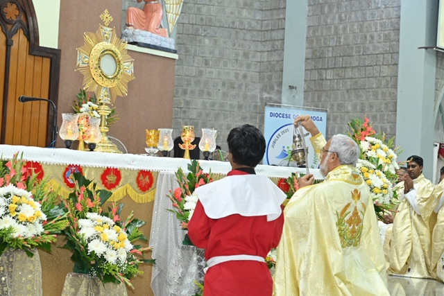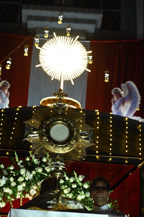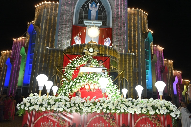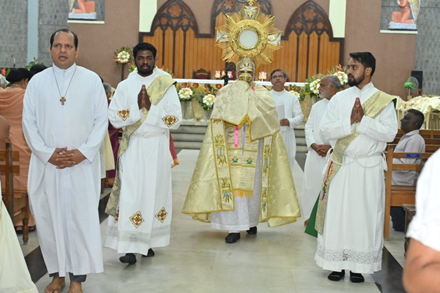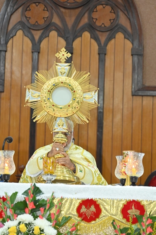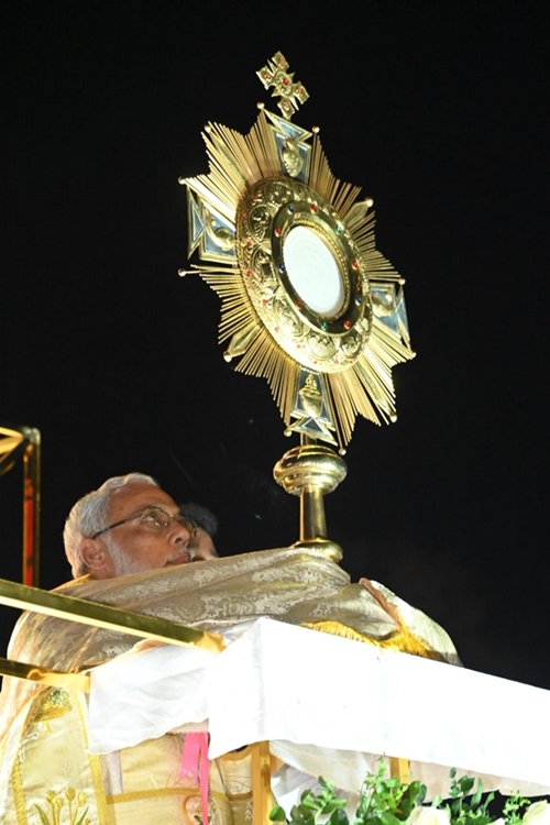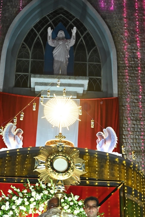 Upon the return of the eucharistic procession to the church, Fr Franklin D'Souza conducted healing prayers, followed by Bishop Duming Dias and Bishop Joseph Arumachadath leading the benediction and final blessing.