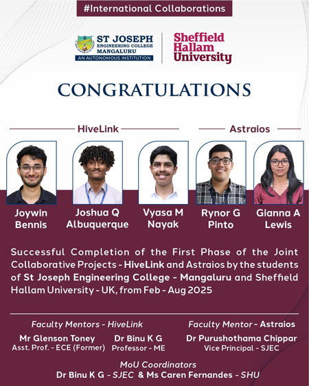 Mangaluru, Nov 25: St Joseph Engineering College (SJEC), proudly announces the successful completion of the first phase of two international collaborative student projects namely HiveLink and Astraios, conducted in partnership with Sheffield Hallam University (SHU), UK. The projects took place between February and August 2025, marking a significant milestone in SJEC’s expanding global academic collaborations.