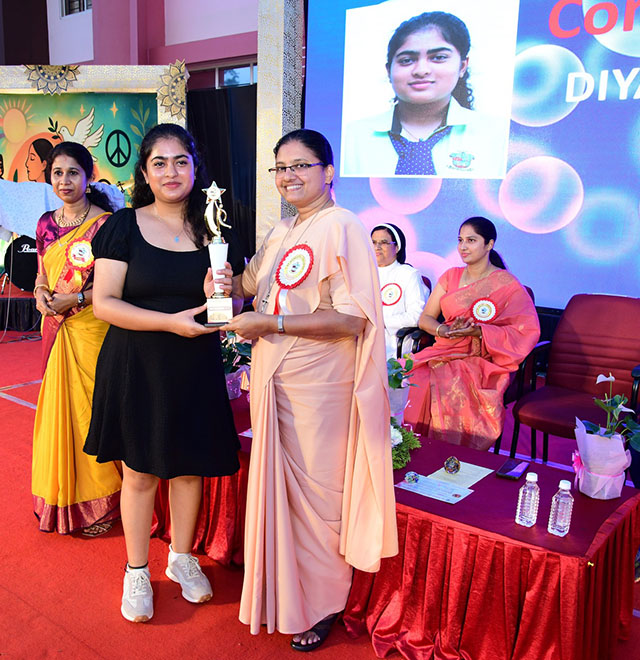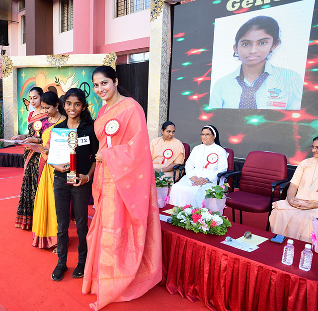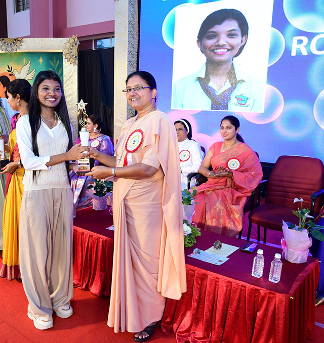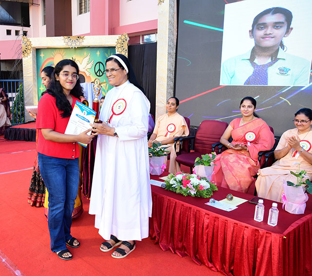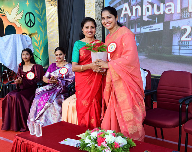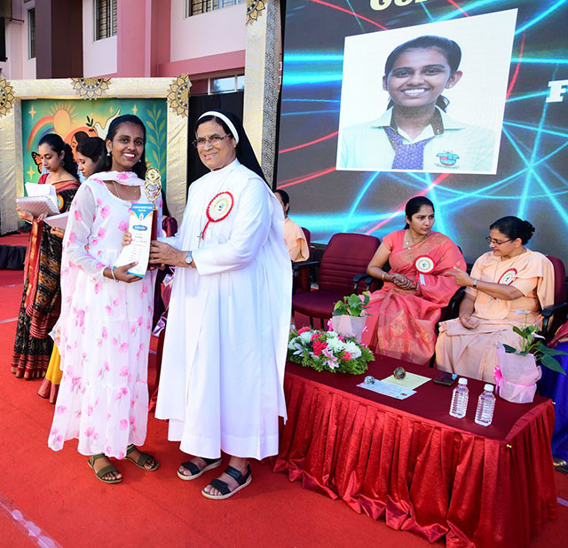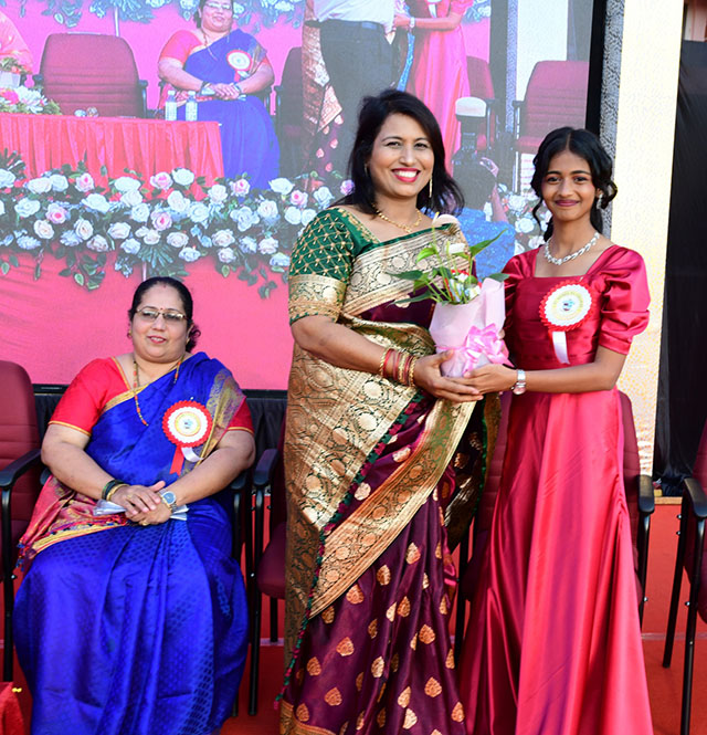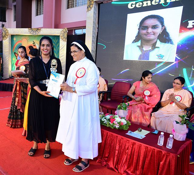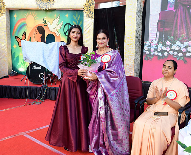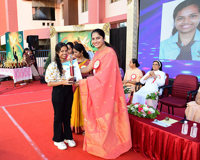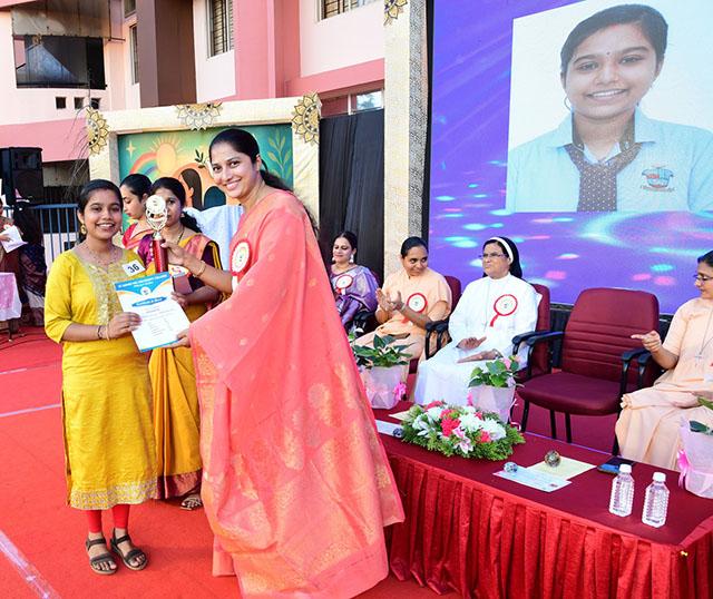 The principal, Sr Norine D’Souza, extended a gracious welcome to the august gathering and introduced the chief guest. Drawing from her experience in the air wing, commander Preeth shared that discipline is not just a virtue but the very foundation that keeps an aircraft and a person steady and on course. She explained that life offers many choices, just as every flight has multiple possible routes, but wisdom lies in choosing the right direction. She beautifully compared challenges to moments of turbulence. They may shake us for a while, but with patience, perseverance, and trust in ourselves, we can get through them and find calm skies again. Congratulating the achievers and motivating the others she inspired the students with the message that dreams are valid, aspirations are achievable, and our potential is truly unlimited. She also expressed her heartfelt gratitude to the management, the principal, and the staff for their dedicated efforts in shaping the youth and guiding them towards becoming responsible citizens of the nation.