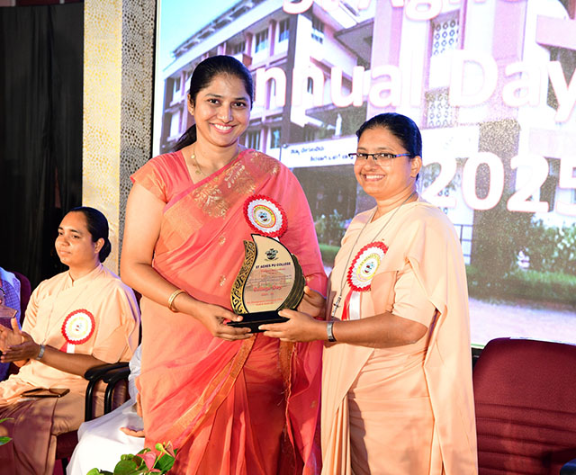 The significant part of the evening was the felicitation of student achievers. The chief guest wing commander Preeth D’Souza, joint secretary of St Agnes Institutions -Dr Sr Maria Roopa and The principal- Sr Norine D’Souza honoured exemplary students excelled with dedication and determination in various fields. National level sports achievers were felicitated along with their parents for their outstanding performance and for proudly representing the college on prestigious platforms. Students who demonstrated exceptional academic brilliance were awarded certificates of merit, acknowledging their hard work and perseverance. The best outgoing students of the year from Science – Sharal Correa. Commerce – Sonaly Ferrao, and Arts – Roopashree were applauded for their excellence, leadership, and commitment. The PTA best outgoing student was awarded to Diya Dechamma for her commendable service and exemplary all-round performance. The student cabinet and the team captains were honoured for their responsible leadership and dedicated service to the institution.