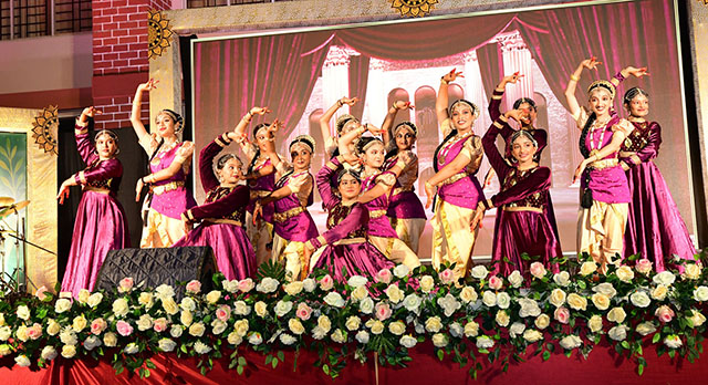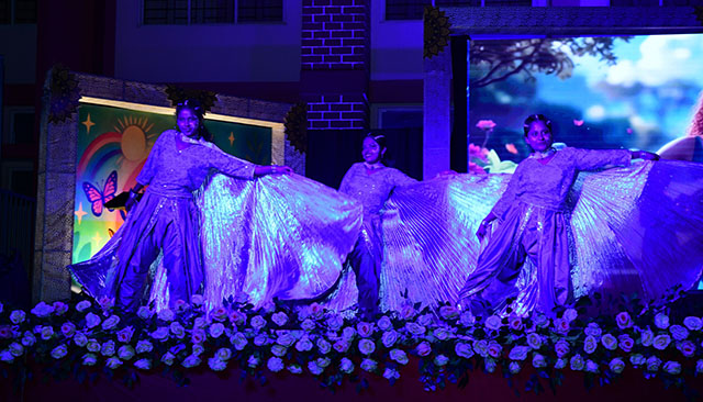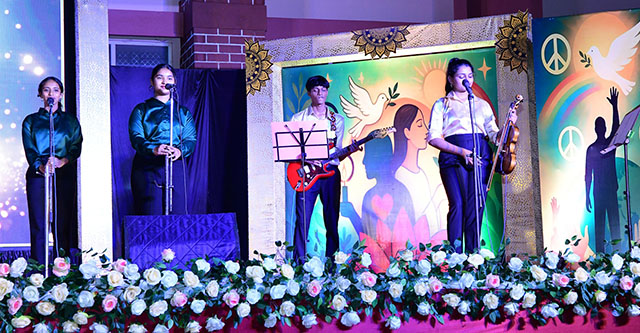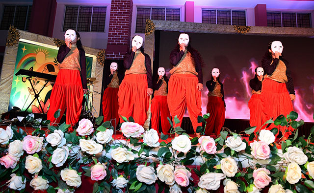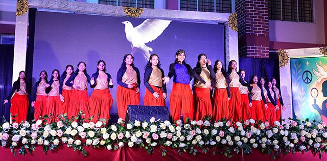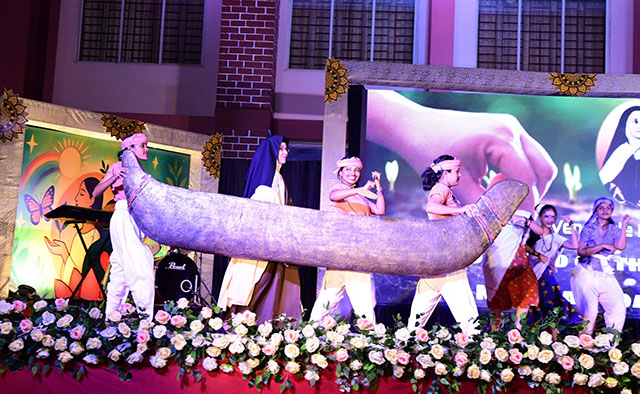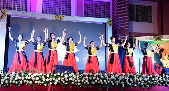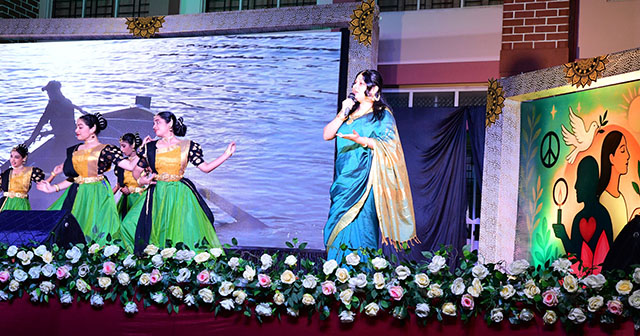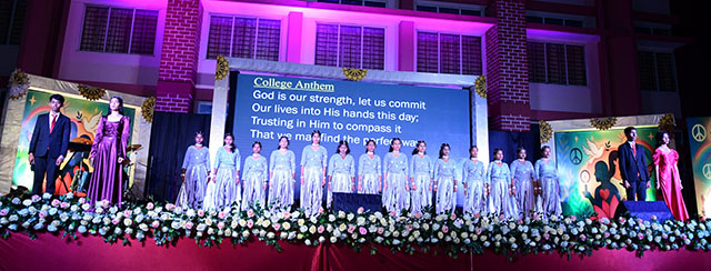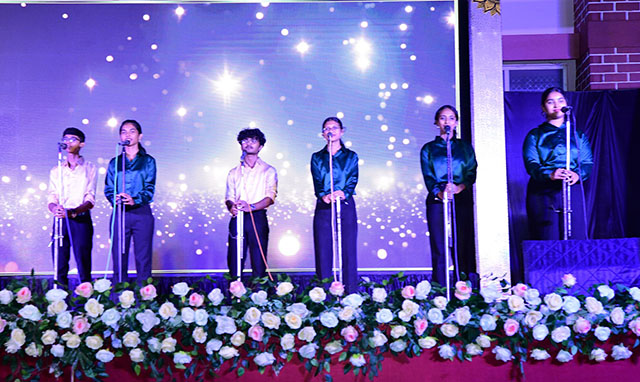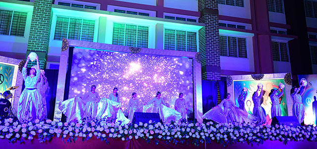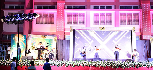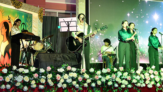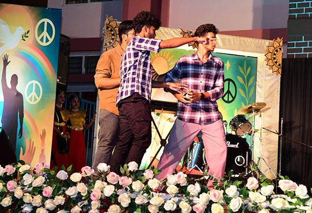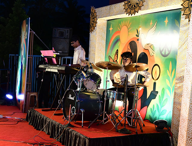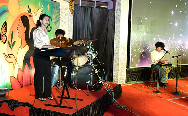The cultural extravaganza that unfolded was a spectacular fusion of artistry, creativity, and an impactful social message. The evening commenced with a powerful orchestra performance by the exceptionally skilled musicians, setting a magnificent tone for the celebrations. The welcome dance added a touch of divine elegance, beautifully portraying the theme through rhythmic grace. The live band performance created an electrifying soundscape, captivating the audience with vibrant melodies and spirited dynamism. The college annual report was screened, offering a vivid and inspiring glimpse into the institution’s achievements, milestones, and transformative initiatives of the academic year.
