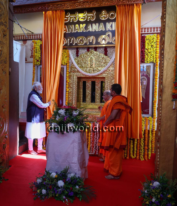 Upon reaching the Kanaka Gopura, the Prime Minister alighted from his vehicle and offered floral tributes to the statue of Kanakadasa. He then had the sacred darshan of Lord Krishna through the Kanakana Kindi, the iconic window associated with Kanakadasa’s devotion.