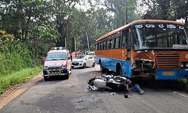 The accident occurred near the Parpikal bridge curve at Nidlle when a bike heading from Dharmasthala towards Bengaluru collided with a KSRTC bus coming from Subrahmanya towards Dharmasthala.