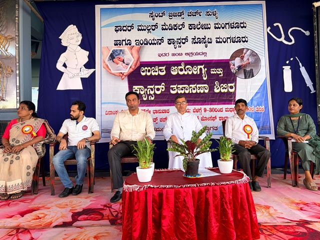 Ranjan, regional coordinator of the Indian Cancer Society; Caroline Smita, associate professor at Father Muller College of Nursing, Mangaluru; Naveen Machado, vice president of the St Brigid’s Church parish council, Sullia; and secretary Julia Crasta were present on the dais.