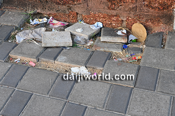Damage to the infrastructure is evident throughout. The protective walls lining both sides have weakened, and numerous granite slabs are cracked or missing. Interlock tiles have lifted unevenly, posing a tripping hazard for walkers and making the area unsafe.
