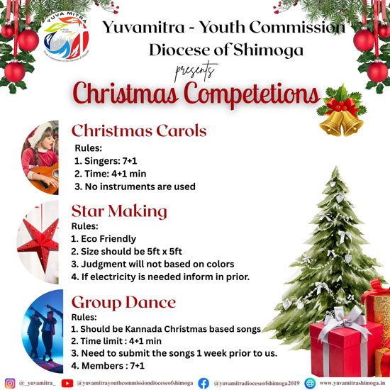 Following the Christmas Youth programme 2025, the results were announced. In the carols singing competition, Cathedral secured the first prize, with Sharavathi Nagar parish receiving the second prize. For the Christmas Dance competition, Cathedral was awarded the first prize, and Hosanagara parish earned the second prize. Finally, in the Christmas Star Making competition, Cathedral again achieved the first prize, and Sharavathi Nagar Parish was awarded the second prize.