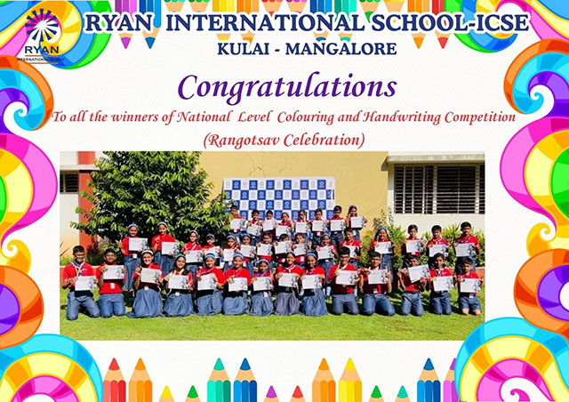 Mangaluru, Dec 13: As Ryan Group of institutions proudly celebrates its golden jubilee – 50 glorious years of excellence, this landmark year has been further illuminated by an exceptional national-level achievement in the field of art and creativity. Talented students of Ryan International School, Kulai – Mangaluru, participated in the national-level art competition conducted by Rangotsava Celebration – Organisation for national-level art competition, and their outstanding performance has brought immense pride and honour to the school.