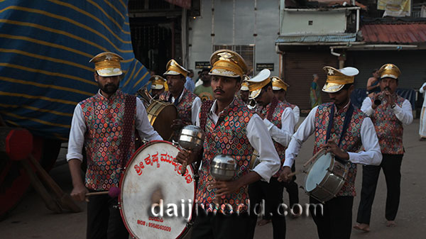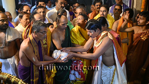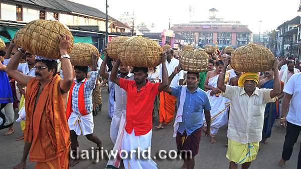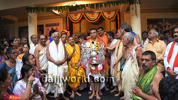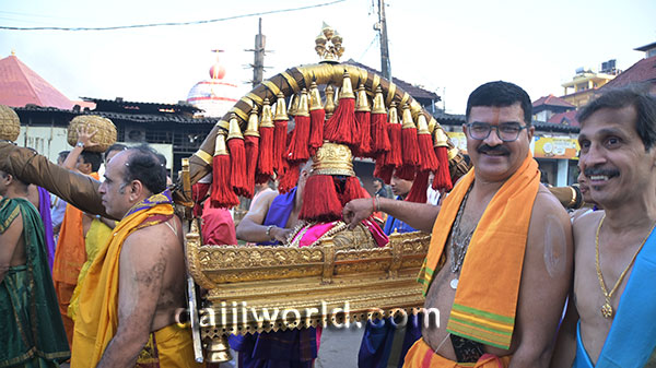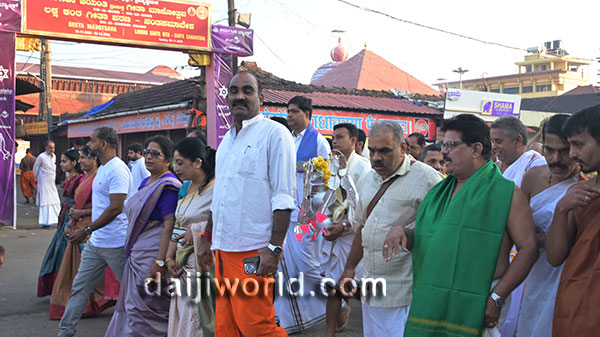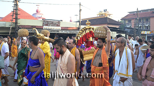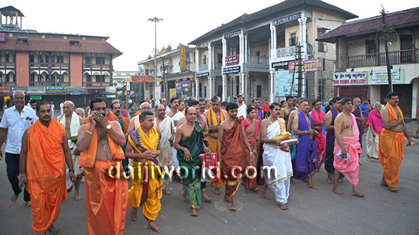After coming back to the Shiroor Math, grain mudi was taken on head, short mudi on the golden palanquin and procession on the Car Street. Four mudi were offered in the Gadduge of Sri Krishna Math Badagumalige and worship was offered.