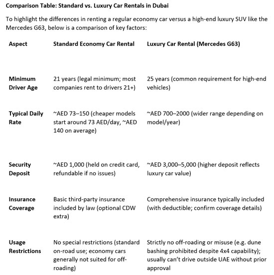 Before planning to hire a G63, make sure you qualify under UAE law to drive. Many visitors can drive in the UAE with their home country’s license, but if your license isn’t from a country on the approved list, you will need an International Driving Permit (IDP) in addition to your license. You must also be of legal age — at least 21 years old (some agencies insist on age 25+ for a high-end vehicle like the G63). Have your passport and tourist visa handy as well, since rental companies will ask for these documents to verify your identity.