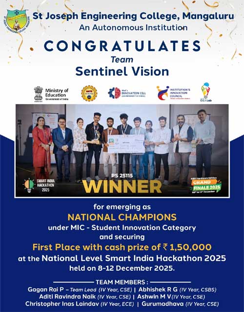 Mangaluru, Dec 18: A student team from St Joseph Engineering College (SJEC), Mangaluru, has brought national acclaim to the institution by emerging as national champion at the Smart India Hackathon (SIH) 2025, one of the world’s largest innovation hackathons and India’s premier problem-solving platform.