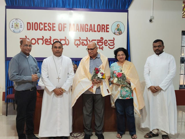 Michael D’Souza and his wife Flavia D’Souza were felicitated with shawls and floral bouquets by the dioceses of Karwar and Gulbarga.