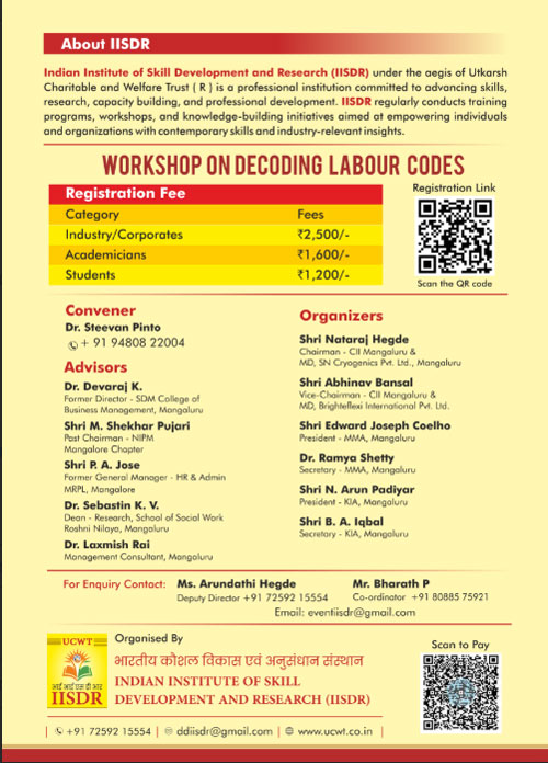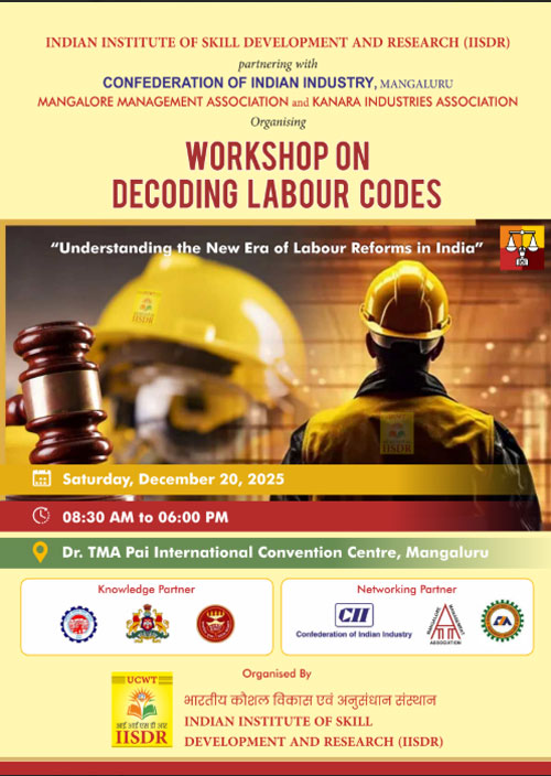 Mangaluru, Dec 18: The Indian Institute of Skill Development and Research (IISDR), under the aegis of Utkarsh Charitable and Welfare Trust (R), is organising a one-day workshop titled “Decoding labour codes – Understanding the new era of labour reforms in India” on Saturday, December 20, from 8.30 am to 6.00 pm at the Dr TMA Pai International Convention Centre, Mangaluru. The workshop is being organised partnering with Confederation of Indian Industry (CII), Mangaluru, Mangalore Management Association (MMA), and Kanara Industries Association (KIA).