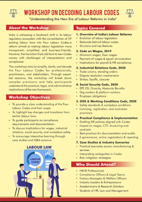 India is witnessing a landmark transformation in its labour regulatory framework with the consolidation of 29 existing labour laws into four labour codes covering wages, industrial relations, social security, and occupational safety, health and working conditions. While these reforms aim to simplify compliance and make labour laws more transparent and business-friendly, they also pose significant challenges in interpretation and implementation. The workshop is designed to bridge this gap by decoding complex legal provisions and translating them into practical, actionable insights for organisations and professionals.
