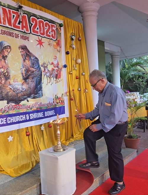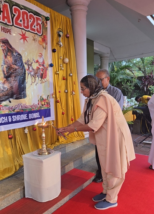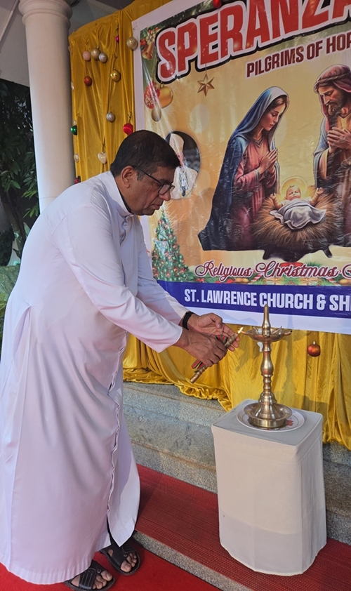 This was followed by the lighting of the Christmas lamp, symbolising Christ as the Light of the World. The lamp was lit by Fr Andrew Leo D’Souza, parish priest of St Lawrence Church & Shrine; Fr Gregory, SVD; Fr Peter Gonsalves; Sr Leela; postulant sister; and Fr Biju Alappatt (Betharram).