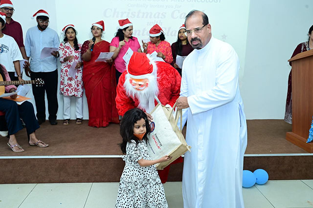 Adding colour and delight to the day, MSW students engaged the children and parents with lively dances and interactive activities, while a captivating puppet show by Ujwala Krishna Raj drew laughter and applause. Christmas gifts, treatment funds, and bridge funds for paediatric and other cancer patients were generously supported by the Indian Cancer Society, team Karnataka, and Oracle Solutions. Santa Claus for the day, Denzil Rego, brought alive the magic of Christmas with gifts and cheer, while Harold Moras and his team lovingly provided cake and lunch for patients and families across the wards.