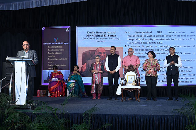 The Kudla Beacon Award, symbolising fire as a force of light, hope and continuity, was awarded to Michael D’Souza for his global enterprise, empathy-driven philanthropy and sustained social impact. In his address, D’Souza humbly acknowledged the Almighty for granting him the ability to generate wealth and the generosity to share it with those in need. He reflected that he sees himself only as a custodian with a responsibility to give back. Emphasising the importance of recognising good work, he noted that visibility creates momentum, and momentum creates more good, while also commending the institution for its long-standing service-oriented mission.