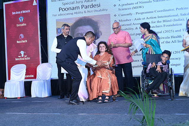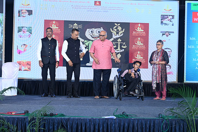 The Special Jury Award, instituted in the name of Nazneen Abdulla Yenepoya, was conferred on Poonam Pardeshi for her outstanding advocacy that champions ability rather than disability. Accepting the award, Poonam expressed her deep gratitude to the School of Social Work and the Roshni Alumni Association for the recognition. She acknowledged the unwavering belief and support of her parents, stating that the award serves as a powerful encouragement to continue her work. She dedicated the honour to countless persons with disabilities and strongly emphasised that people with disabilities do not seek pity, but demand dignified access, equality and true inclusion. She articulated her vision of building an inclusive and egalitarian society where everyone can thrive without barriers.