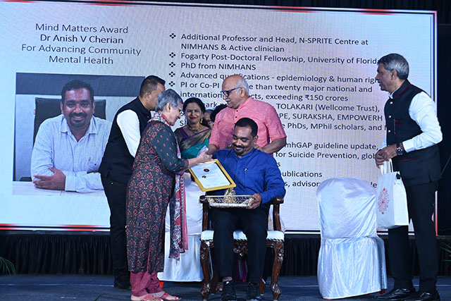 The Mind Matters Award was conferred on Dr Anish V Cherian for his contributions to mental health advocacy and community-based interventions. Dr Cherian shared that social work has always been an integral part of his life and reflected on the lack of access to mental health services at the community level. He spoke about beginning his work within communities, particularly in the area of suicide prevention, and stressed the urgent need to normalise conversations around mental health. He reminded the audience that the world needs empathy and collective support, calling for greater awareness and action in suicide prevention.