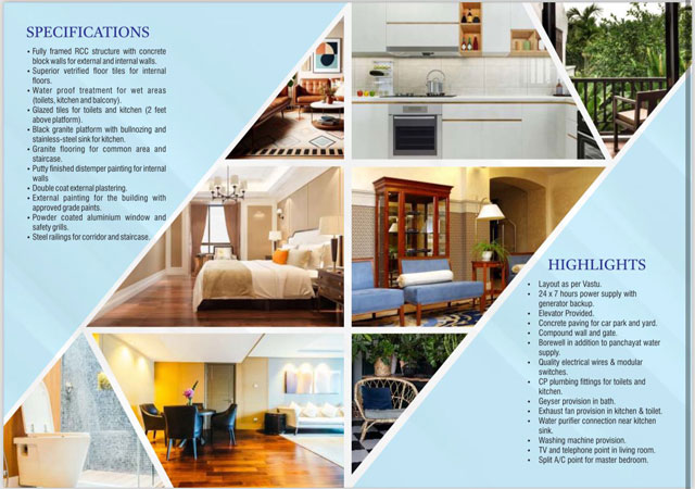 Adequate water supply is ensured through a borewell in addition to the panchayat water connection. The apartments are fitted with high-quality electrical wiring and modular switches, along with CP plumbing fittings for kitchens and bathrooms. Additional provisions for geysers in bathrooms, exhaust fans in kitchens and bathrooms, water purifier connection near the kitchen sink, washing machine provision, TV and telephone points in the living room.