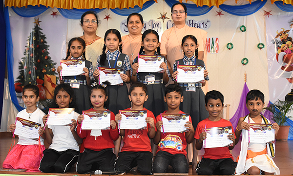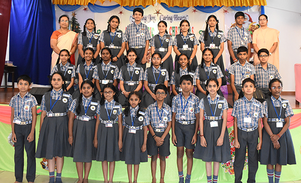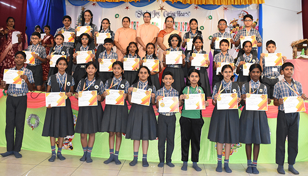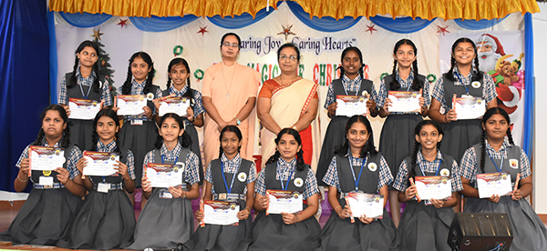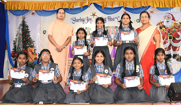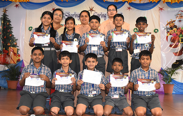 Prizes for the various competitions were distributed to the proud winners by Sr Preethi, Sr Priya AC and Jenifer. The school head boy, Sharan and head girl, Aarushi awarded the scholar badges to the highest scorers.