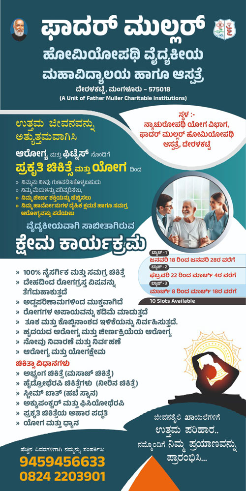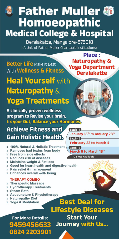 Mangaluru, Dec 27: With lifestyle diseases emerging as a silent epidemic of the modern age, a new wellness centre focusing on naturopathy and yoga has been established at Father Muller Homeopathic Hospital, Deralakatte, with the objective of promoting holistic health and preventive care.