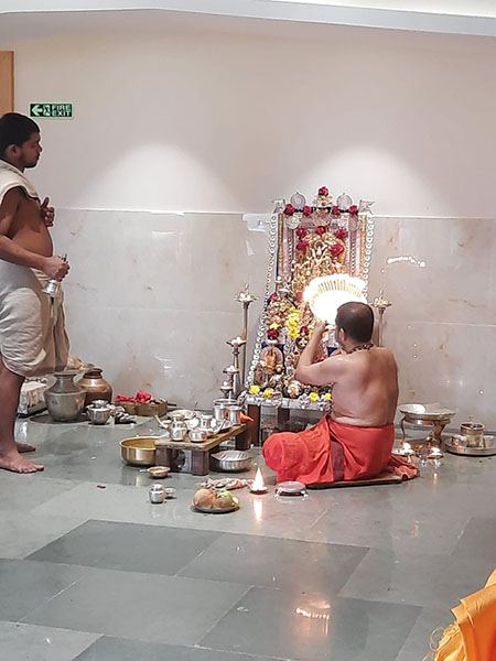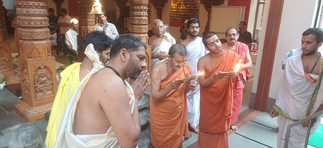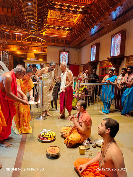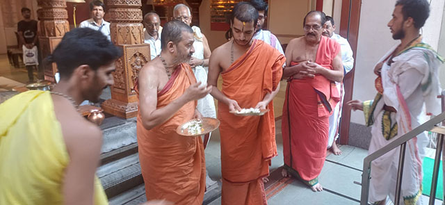 Following the discourse, Dr Suresh Rao and his spouse performed Padapuja for the Swamijis, offering ceremonial gifts and receiving mantrakshate blessings. Special puja was also conducted for Lord Rama at the Gopalakrishna temple in the presence of Sri Sri Vidyadhish Teertha Sripad, after which the Swamijis performed puja to Lord Gopalakrishna and bestowed blessings on all devotees.