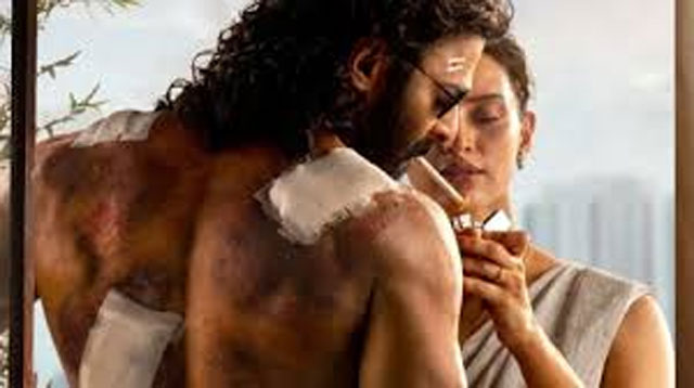 The poster shows Prabhas shirtless, his back facing the camera, visibly bruised and wrapped in bandages. Despite his injuries, the actor is seen holding a liquor bottle and smoking, exuding a raw and brooding intensity. Triptii Dimri, dressed in a grey sari, is seen lighting a cigarette for him, adding to the gritty visual narrative.