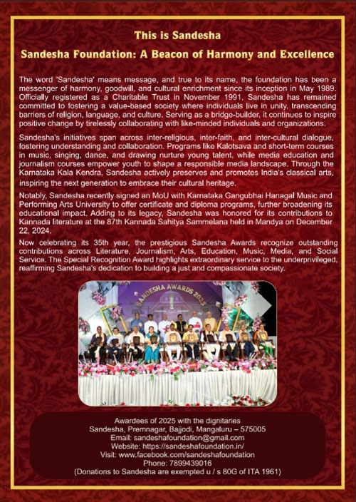 In a major academic development, Sandesha has recently signed a Memorandum of Understanding (MoU) with the Karnataka Dr Gangubhai Hangal Music and Performing Arts University, enabling the institution to offer certificate and diploma programmes, thereby expanding its educational outreach. Adding to its distinction, Sandesha was honoured for its contribution to Kannada literature at the 87th Kannada Sahitya Sammelana held in Mandya on December 22, 2024.