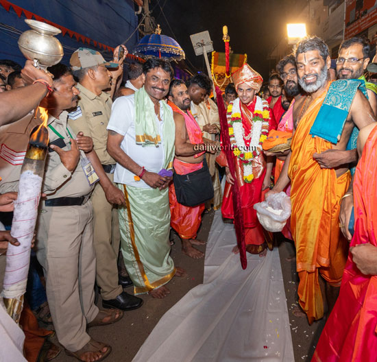 Sri Vedavardhana Theertha Swamiji was accorded a grand welcome at the Math, with a white carpet laid along the entire Car Street for his ceremonial walk.