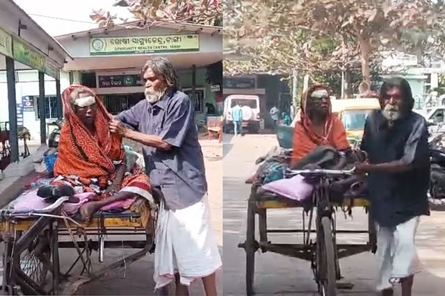 The elderly man, Babu Lohar, a resident of Sambalpur’s Gole Bazar area, transported his 70-year-old wife Jyoti, fondly known as Jolley, to SCB Medical College and Hospital, braving harsh weather, dust and physical exhaustion throughout the journey.