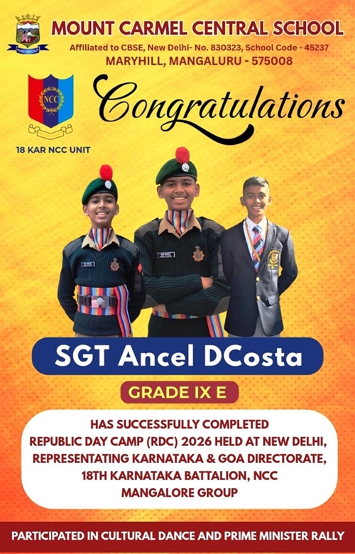 Mangaluru, Jan 30: Mount Carmel Central School, Mangaluru, has announced that one of its junior division cadets from the NCC Army Wing represented the Karnataka and Goa directorate at the prestigious Republic Day Camp (RDC) 2026 held in New Delhi.