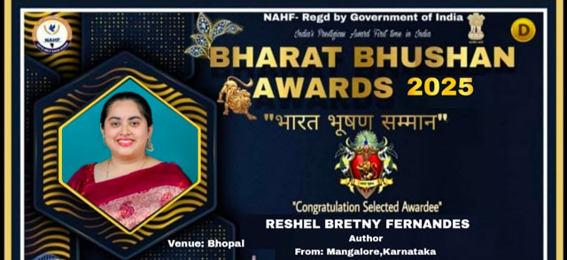 Title: Reshel Bretny Fernandes selected for Bharat Bhushan Award 2025; felicitation in Bhopal in Feb