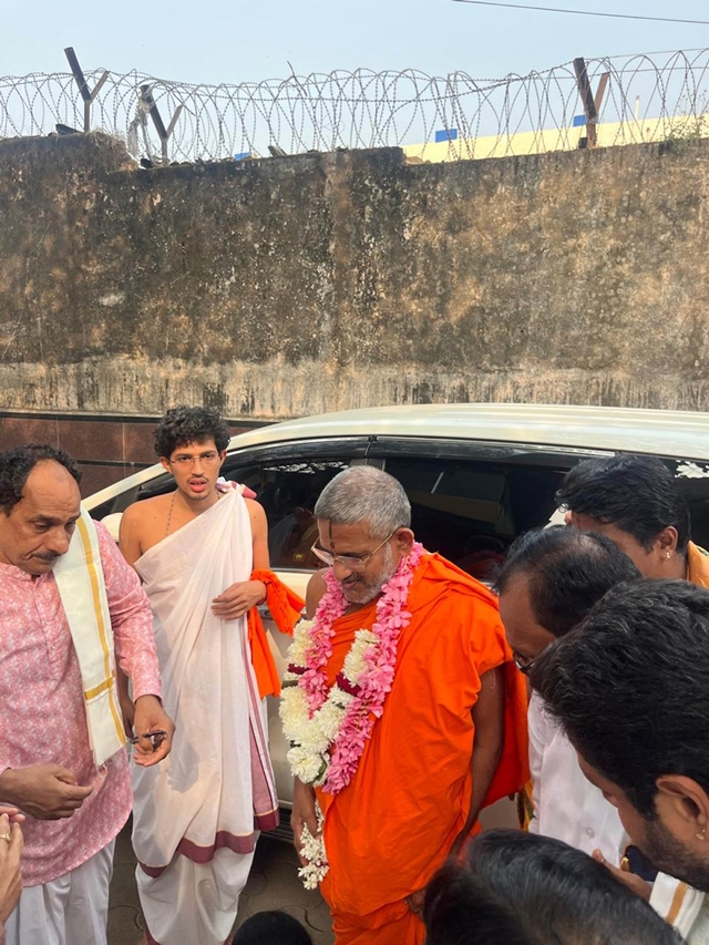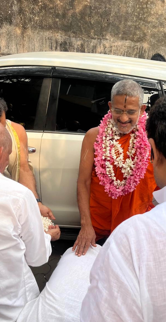 Earlier, Swamiji was accorded a traditional welcome with chende percussion. He later offered prayers and aarti to Shri Ambika Devi, Shri Adinatheshwara and Shri Mahaganapati at the temple.