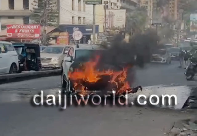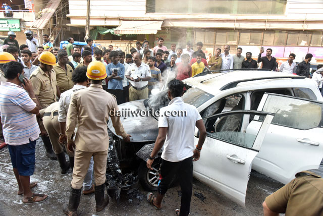 The driver of the car, who noticed smoke emanating from the engine area while passing in front of the main entrance of the bus stand, displayed quick presence of mind by immediately stopping the vehicle and jumping out. Within moments, the front portion of the car was engulfed in flames.