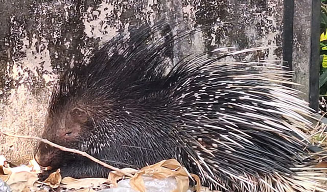 As people began gathering at the location, the porcupine moved towards the bushes behind the residence of advocate Purandara Bhat, president of Puttur Karnataka Sangha.