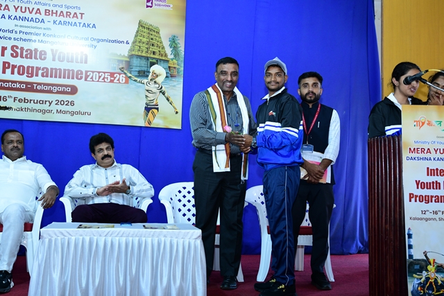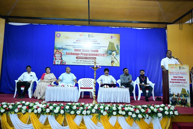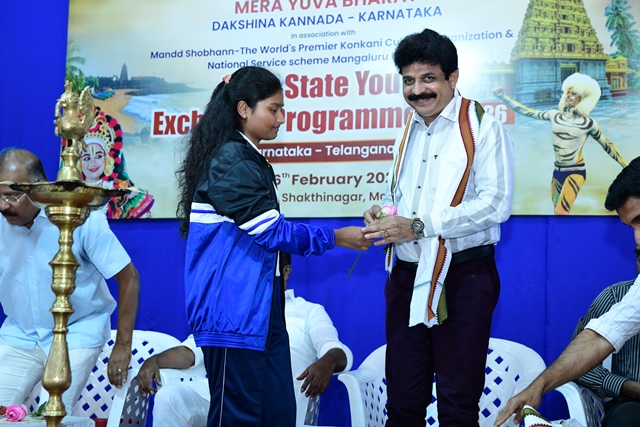 Mangaluru, Feb 12: The inaugural ceremony of the Inter State Youth Exchange 2025-26 was held in Mangaluru, Karnataka, with Telangana as the guest state. The event was organized by Mera Yuva Bharath Dakshina Kannada district Karnataka, ministry of youth affairs and sports, in collaboration with Mandd Shobhann, Shakthingar Mangaluru, and National Service Scheme Mangalore University.The programme will be held from February 12 to 16, at Shakthinagar, Mangaluru and will host a delegation of 37 members, including 35 bright young leaders and 2 escorts representing five districts of Telangana.