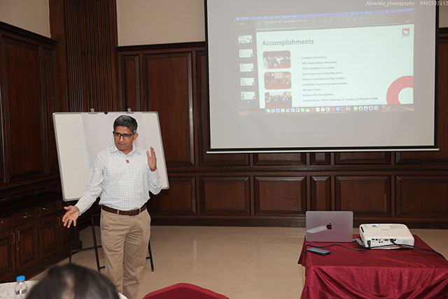 Next, KE member Rishika Miranda (Kyrah Design Studio) and lead member Nigel Fernandes (Catholic Connect) succinctly presented their business pitches. Rishika, while highlighting the 5-year mark of her studio, presented a neat array of her work, target audience and USP alongside collaborative history, especially through the KE network. Nigel highlighted the growing success of Catholic Connect not just in India, but also the pipeline for global utility especially in Dubai, Philippines and Bangladesh.