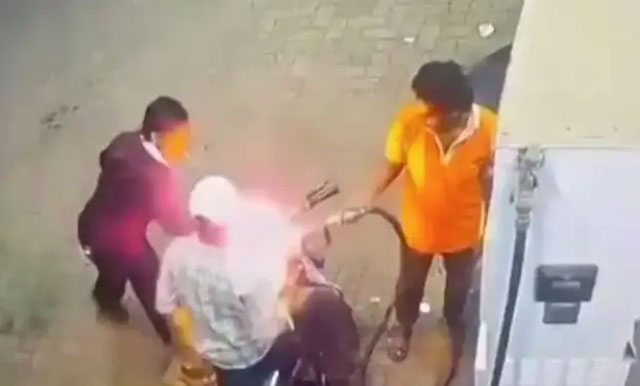 However, in a sudden and reckless act, Kshatri stepped forward and used a lighter to set fire to the motorcycle’s fuel tank and the petrol dispenser nozzle. The flames quickly erupted, causing chaos at the fuel station, which had several customers and vehicles at the time.
