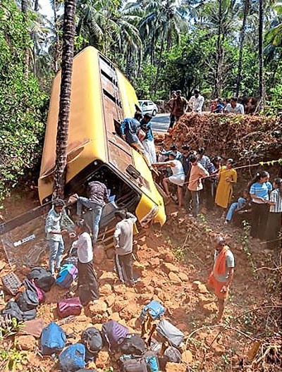 Byndoor, Feb 24: A private college bus that was transporting students to an NSS camp being held at Sulagodu School in Hallihole village met with an accident near Shettipalu in Hallihole village after the bus lost control and fell.